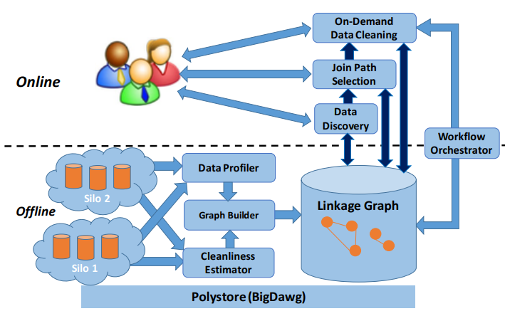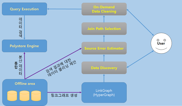 사용자는 데이터 검색을 요청했을 때, 검색 모듈(Data Discovery)은 Offline에서 미리 만들어놓은 링크 그래프를 참조해서 관련 데이터를 얻어 사용자에게 보여주게 됩니다. 그리고 결과를 가져올 때, Source Error Estimator과 Join Path Selection을 통해서 해당 데이터 클리닝을 제안하게 됩니다.