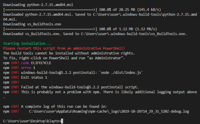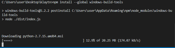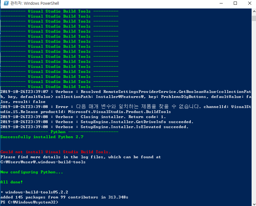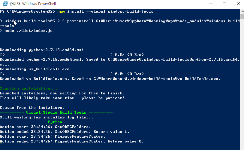 이 명령어를 실행해서 윈도우에서 파이썬을 빌드할 수 있도록 windows-build-tools을 설치합니다.