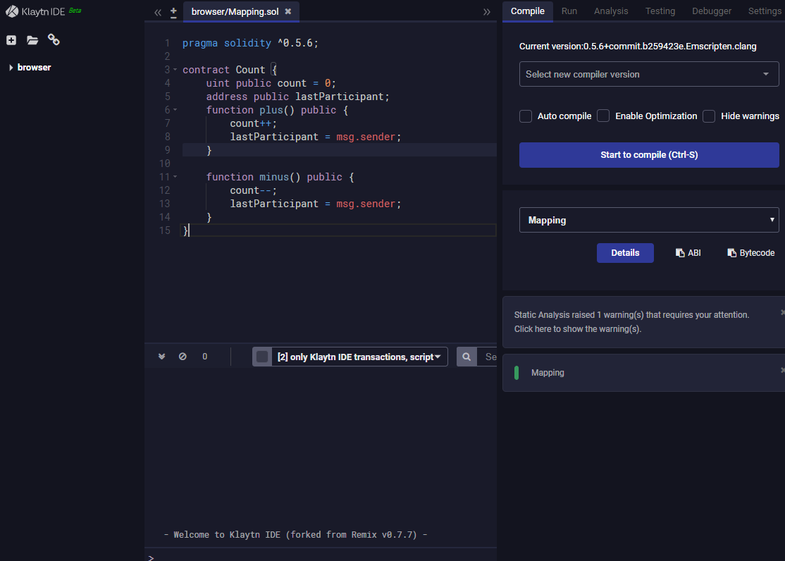다음 포스팅에서는 이렇게 등록한 코드를 caver-js를 통해서 컨트랙트를 실행하는 실습을 진행해보겠습니다.