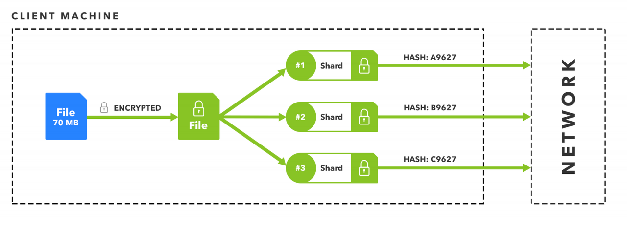 1. 파일이 암호화됩니다. 2. 암호화된 파일을 샤드(파편)로 조각내거나, 여러개의 파일이 결합된 조각을 만듭니다. 3. 사전 검증 처리는 각 조각에 대해 시행됩니다. 4. 샤드는 네트워크로 전송됩니다. |