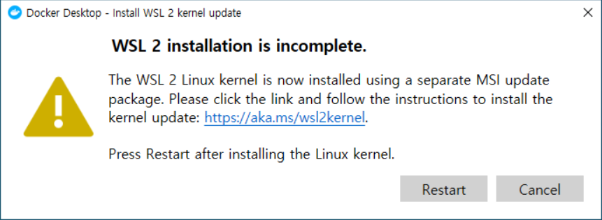 Kernel Update를 진행하는 동안에 위 팝업창은 Cancel로 닫지마시고 업데이트 설치가 완료된 후에 Restart 누르면 자동으로 Docker가 실행되는 걸 볼 수 있습니다.