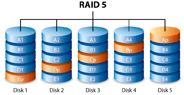보통은 디스크 5개로 구성해서, 각 디스크마다 패리티를 한개씩 분산되어 저장합니다.