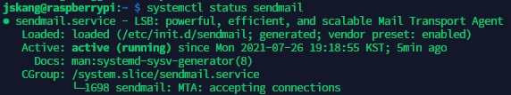위 명령어를 통해서 설치된 메일서비스가 정상적으로 설치되었는지 확인합니다. 여기서 active (running)로 되어있는데, 메일서비스가 설치되자마자 자동으로 시작되었군요.