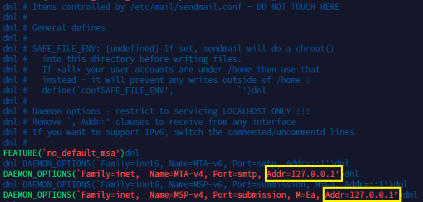 라즈베리파이 내부에서만 메일을 사용하려면 노란색 박스로 된 부분을 127.0.0.1 에서 변경하지 않습니다.