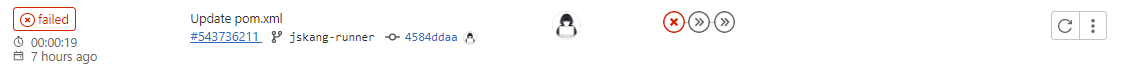작업을 실패하게되면 아래 사진처럼 fail과 어떤 stage 단계에서 실패했는지 아이콘으로 표시가 됩니다.