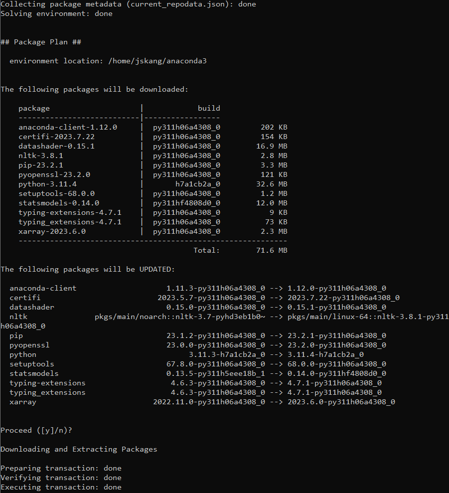 아나콘다의 패키지 전체를 최신으로 업데이트하여 플러그인 및 버전들을 원활하게 설치하는데 도움을 주도록 합니다.